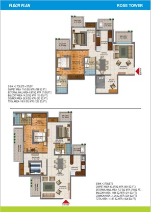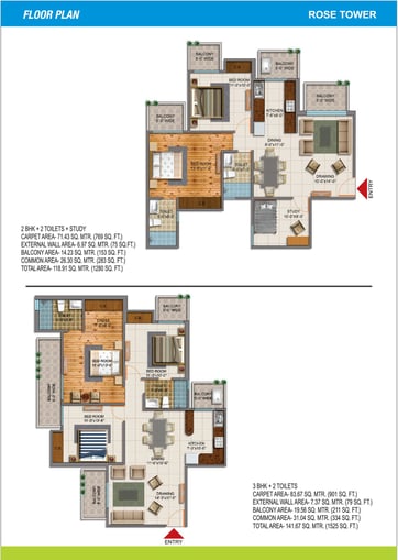 2 BHK + 2 Toilets + Study - 1280 Sqft 3 BHK & 2 Toilets 1525 Sqft.
