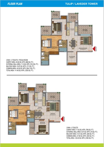 2 BHK + 2 Toilets + Pooja Room - 1200 Sqft. 3 BHK & 2 Toilets - 1350 Sqft.